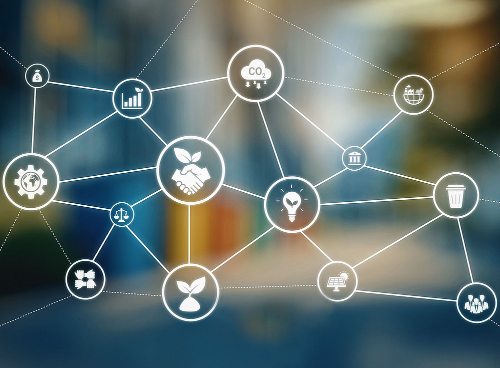 Grafik mit Symbolen zu Umwelt, Soziales und Unternehmensführung, verbunden durch strichlierte Linien, wie ein Netzwerk ©InfiniteFlow - stock.adobe.com